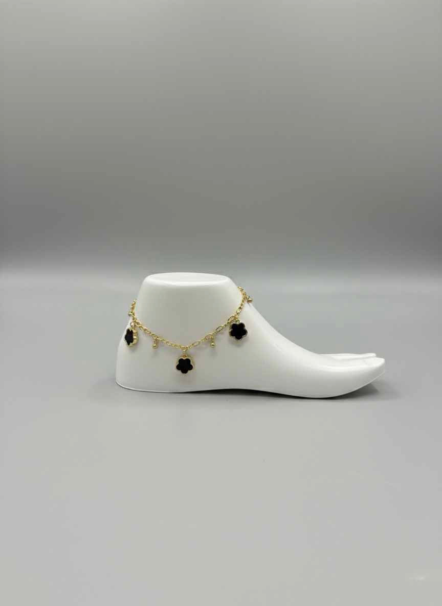 Black Obsidian Flower Charm Anklet – Gold Chain Anklet with Black Dangle Flower Design