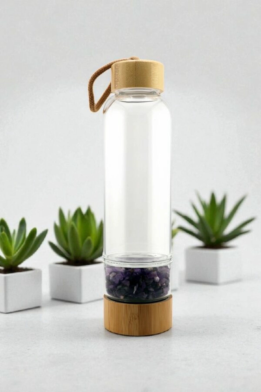 - Includes: 1 clear glass bottle filled with natural Amethyst crystal chips, cork-sealed