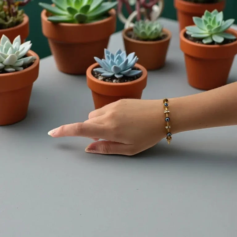 - Material: Gold-tone bangle with Evil Eye charms and crystal spacers