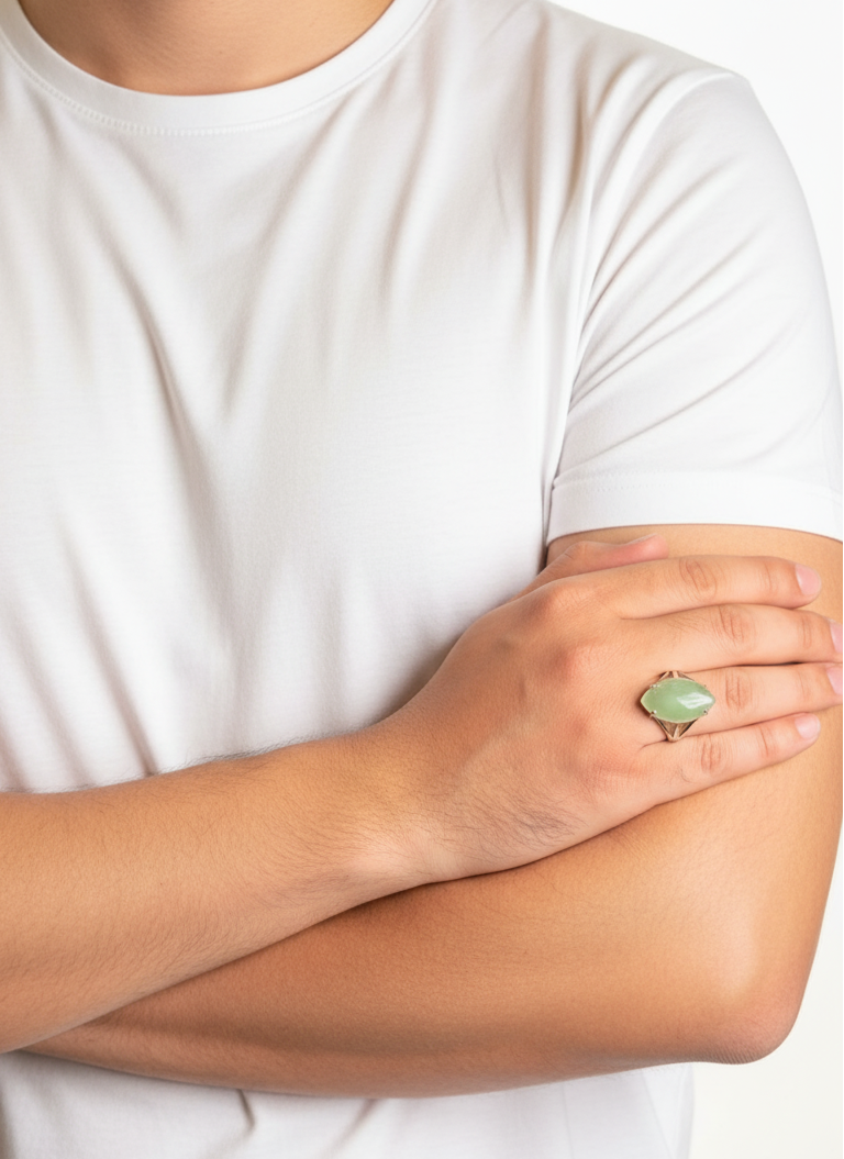 The silver finish enhances the smooth green tone of the stone, helping it blend with casual clothing, office wear, and neutral styles. The ring sits comfortably on the hand and carries a grounded presence without feeling too bold. It is suitable for men who want meaningful jewelry that supports calm confidence and balanced energy.