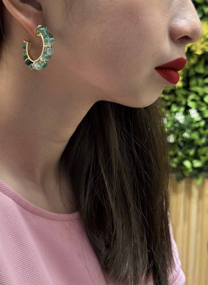 The Jade Bloom earrings blend serenity and strength with vibrant green Jade chips set on sleek golden hoops. Known as the stone of prosperity and protection, Jade brings emotional balance, attracts success, and nurtures the heart. These elegant hoops are perfect for daily wear or as a meaningful gift of good fortune.