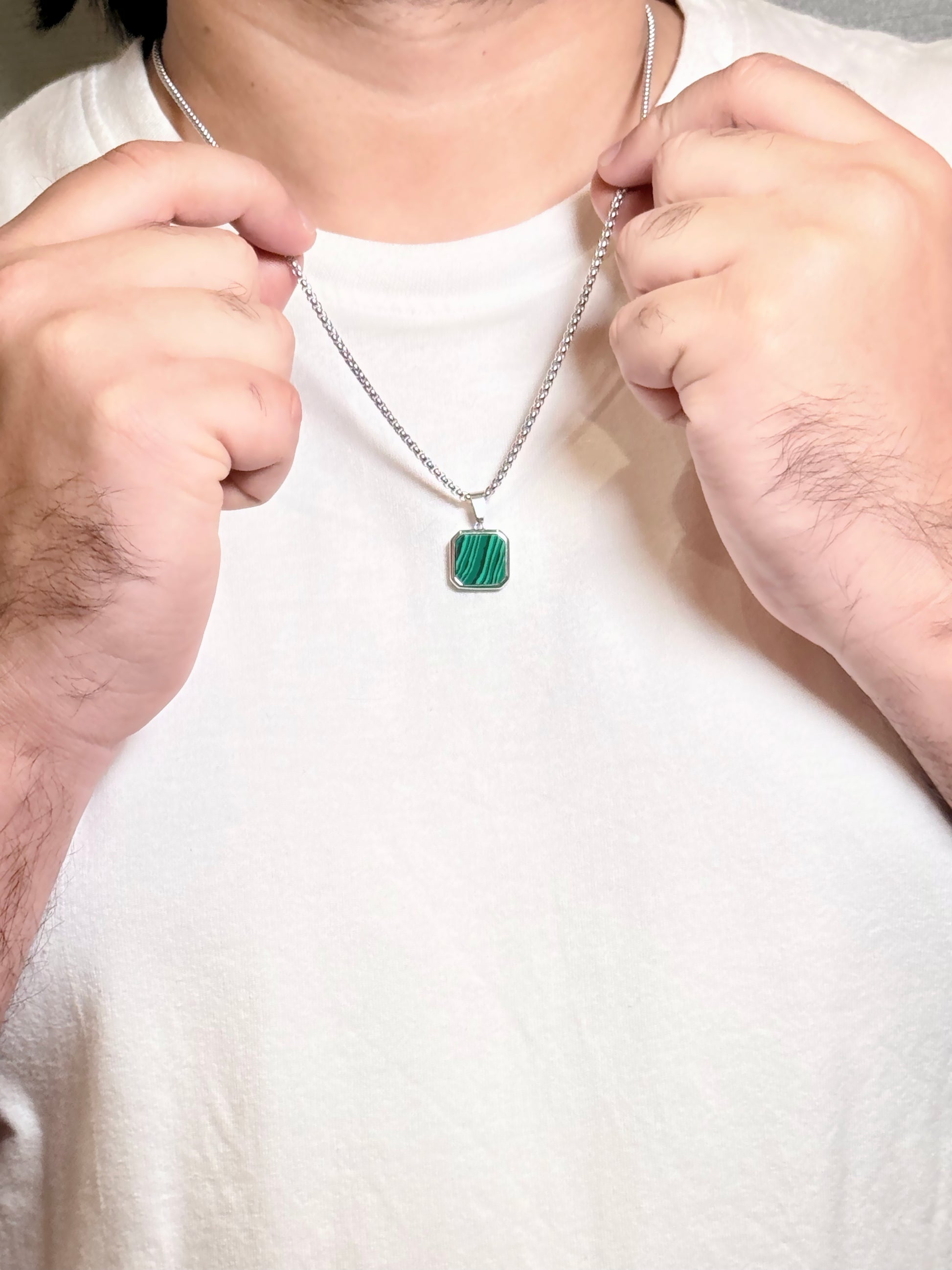 malachite square pendant men’s necklace Its deep green color pairs well with neutral clothing, minimalist wardrobes, and modern streetwear.