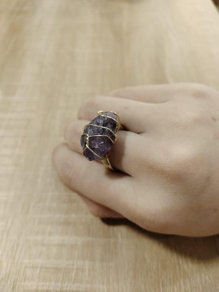 Size: Adjustable gold-tone band with raw wire-wrapped amethyst crystal