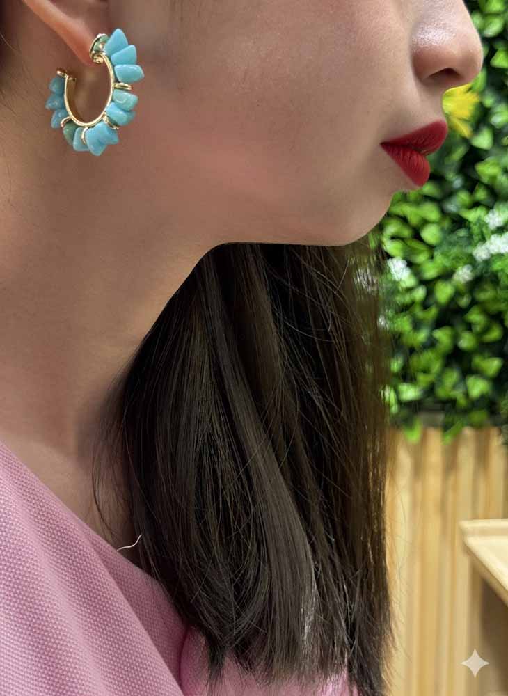 The Ocean Whisper earrings showcase Amazonite stones in a soft aqua hue, wrapped in elegant golden hoops. Known as the stone of truth and harmony, Amazonite calms the nervous system, encourages clear communication, and helps release emotional blockages. These hoops carry the refreshing energy of ocean waves — perfect for a confident, centered soul.