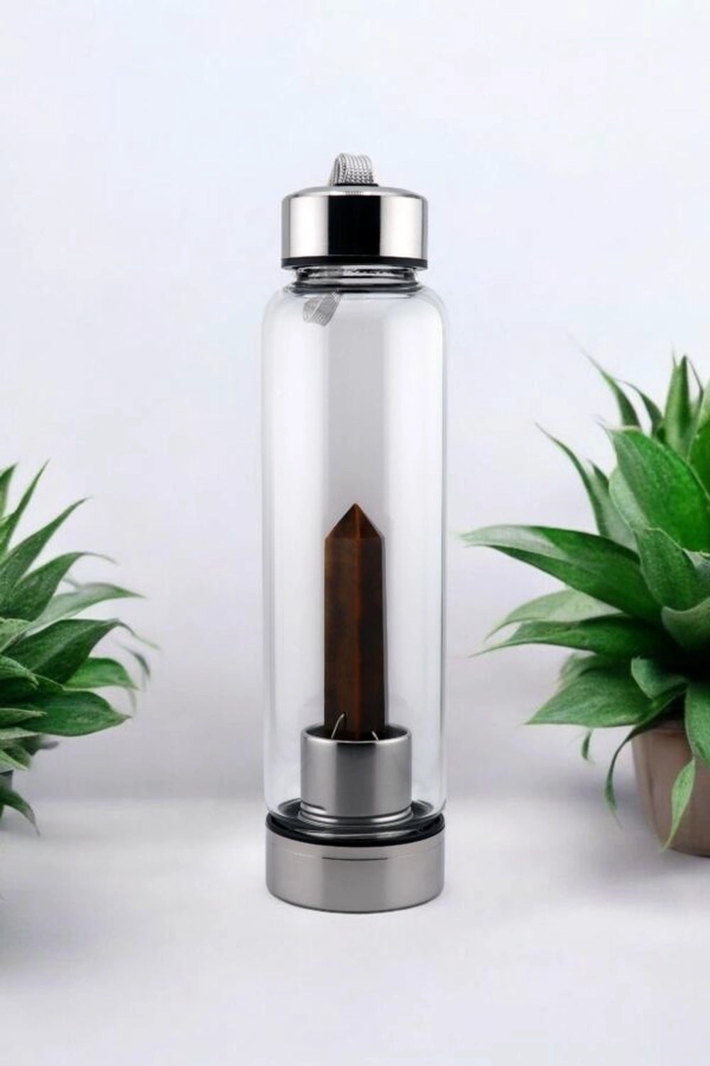 - Includes: 1 glass water bottle with stainless steel base and removable Tiger Eye crystal point