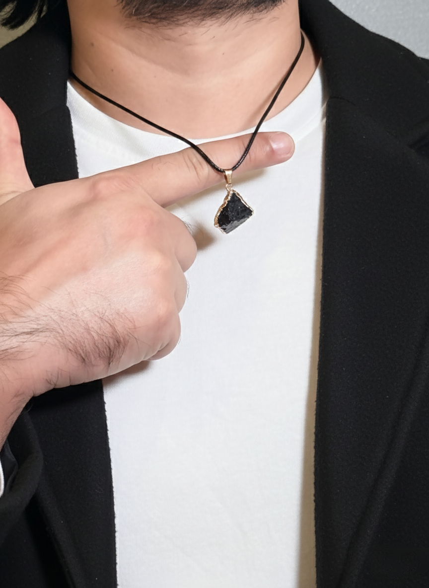 This raw black tourmaline edge pendant men’s necklace is designed for individuals who appreciate natural textures and bold stone character. The pendant features an unpolished black tourmaline stone with organic edges, creating a rugged and distinctive appearance.