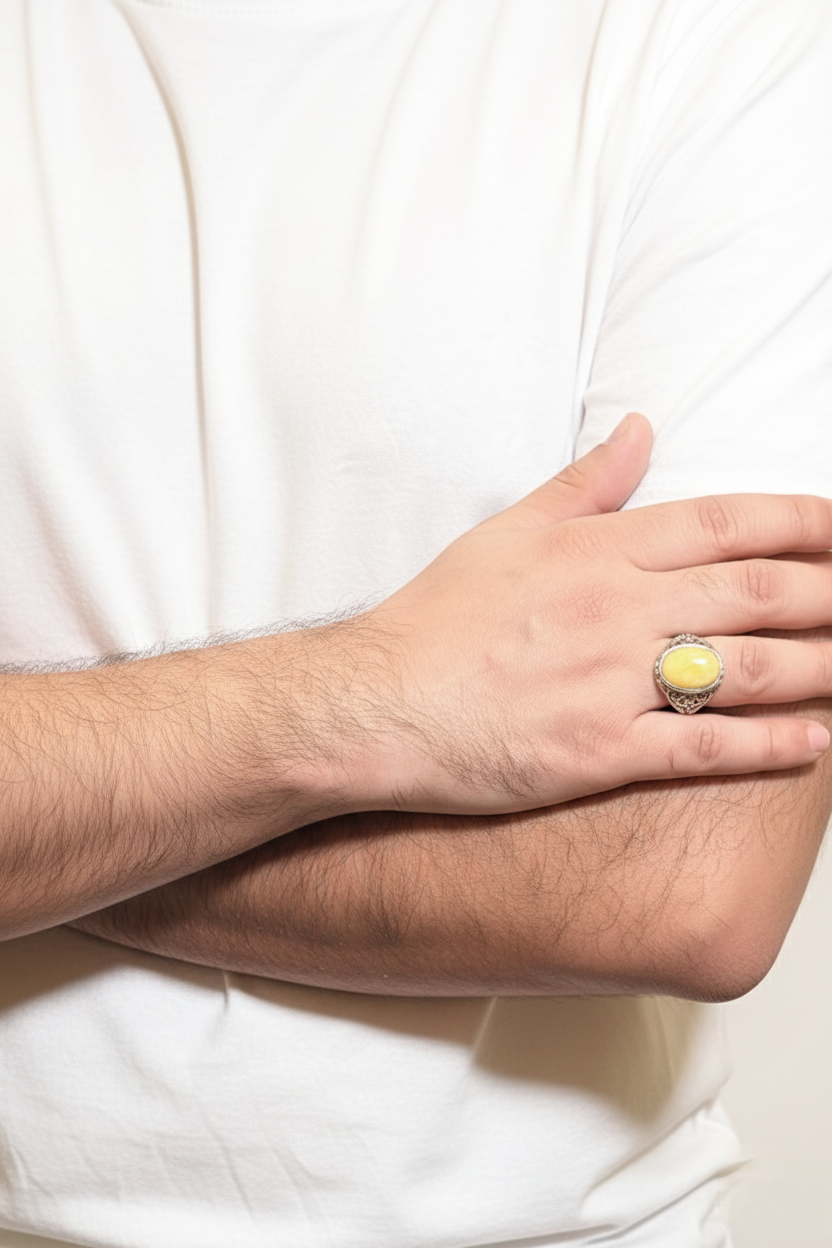 This rounded yellow jade male ring is designed for individuals who appreciate soft color tones and refined detailing in their accessories. Featuring a rounded yellow jade stone set in a silver-toned finish, the ring presents a balanced and elegant appearance suitable for daily wear.
