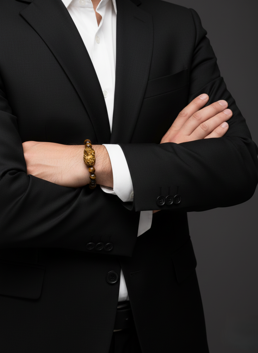 This tiger eye beaded bracelet features warm, natural stone tones paired with a gold-tone Pixiu charm for a bold and balanced unisex design. The smooth, polished tiger eye beads display rich brown and golden hues that create visual depth and a refined finish.