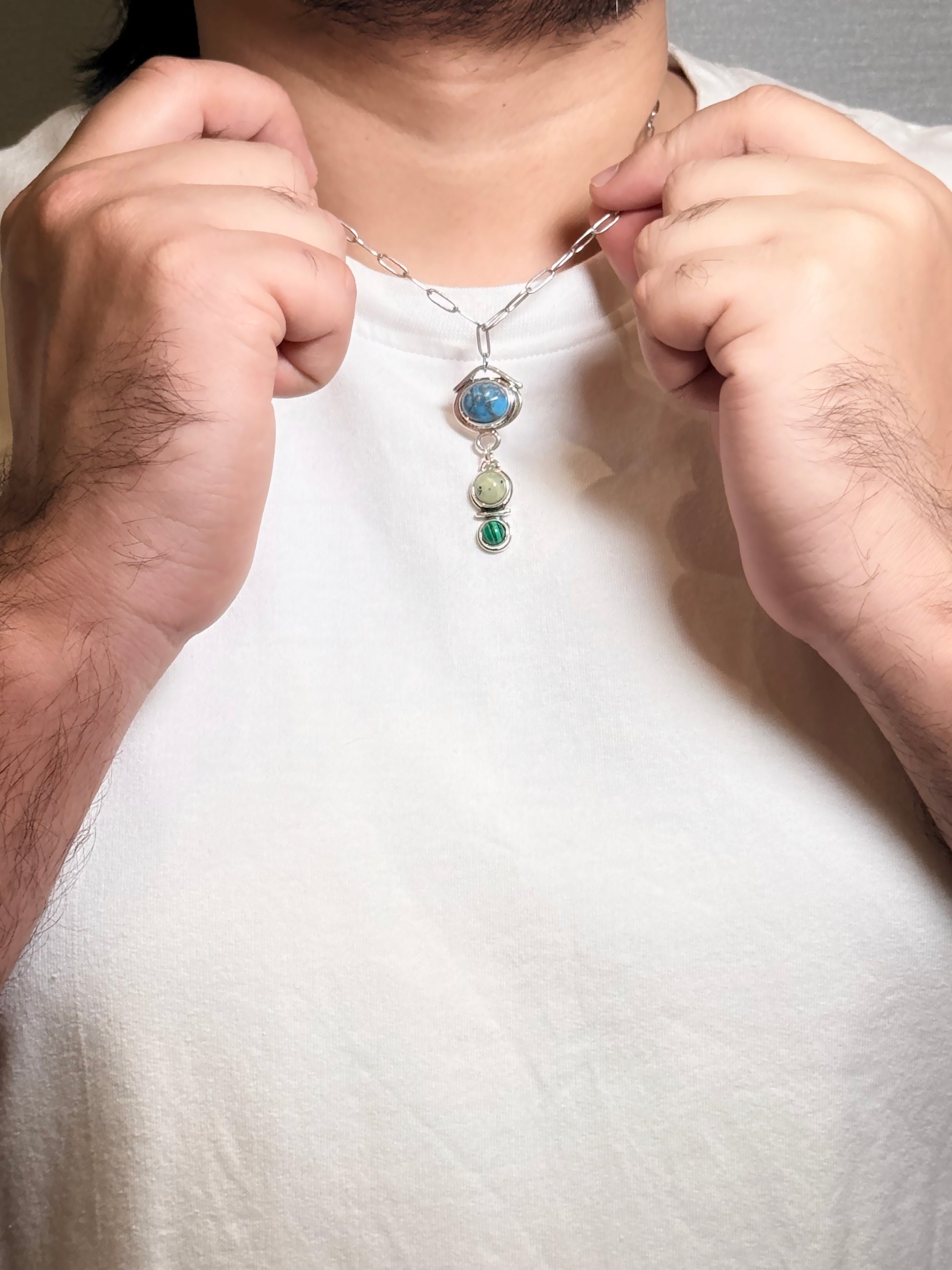 This turquoise, jade and malachite multi-stone pendant men’s necklace reflects a thoughtful blend of natural materials and contemporary design. Crafted for everyday wear, the necklace features a vertically arranged pendant showcasing three distinct stones, each selected for its natural beauty and surface character.